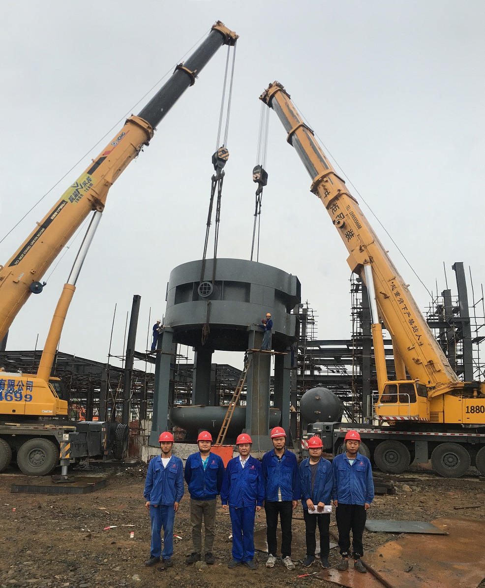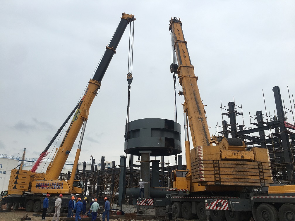 本次吊裝的反應器中段部分重達220噸,分公司領(lǐng)導高度重視,吊裝前期,邀請公司總工吳繼成、總工辦主任牛守義和安全部王岳濤經(jīng)理親臨項目部參與設備吊裝的專題方案討論定稿工作。當日上午,吊裝現(xiàn)場準備工作緊張卻又有條不紊的進行,項目經(jīng)理李子鳳向全體“參戰(zhàn)”員工進行了安全交底,工作人員對兩臺分別為500T、350T吊車的站位及性能再次確認,現(xiàn)場機具、人員均按既定方案實施。分公司經(jīng)理史崇松、業(yè)主單位負責人、監(jiān)理全程在現(xiàn)場“督戰(zhàn)”,全體工作人員經(jīng)過四個小時的奮戰(zhàn),吊裝作業(yè)圓滿結(jié)束。