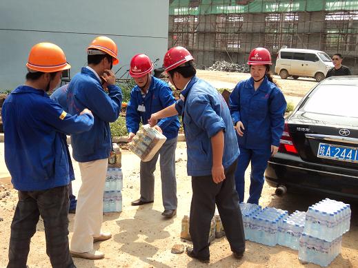 7月28日,氣溫高達(dá)36度,酷暑難耐,分公司書(shū)記、經(jīng)理李貴林,副經(jīng)理史崇松、方斌、劉紅艷一行深入一線工地,慰問(wèn)戰(zhàn)斗在一線的生產(chǎn)、管理人員。每到一處,李貴林同志都會(huì)關(guān)切的詢問(wèn)防暑和安全情況,并將一箱箱礦泉水送到一線人員的手中,使他們?cè)谙娜绽锔惺艿搅艘豢|清爽的涼風(fēng)。
